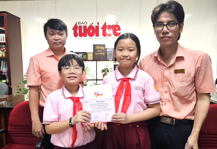 Sáng 10-8, thầy giáo Nguyễn Hồng Phúc – tổng phụ trách đội Trường tiểu học Lương Thế Vinh (phường Tân Bình, TP.HCM) và đồng nghiệp Vũ Thành Nhân đưa hai học sinh khối 5 đến tòa soạn Tuổi Trẻ để gửi gắm tấm lòng của hơn 300 học sinh nhà trường đến miền Trung.